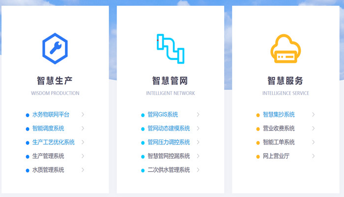 智能投藥系統(tǒng)、配水優(yōu)化調(diào)度系統(tǒng)、管網(wǎng)地理信息系統(tǒng)、管網(wǎng)壓力調(diào)控系統(tǒng)、水力動(dòng)態(tài)建模系統(tǒng)、管網(wǎng)漏損管理系統(tǒng)、二次供水管理系統(tǒng)、智能客服系統(tǒng)